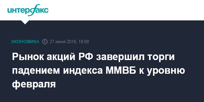 Москва. 27 июня. INTERFAX.RU - Рынок акций РФ в понедельник упал к уровню конца февраля по индексу ММВБ (район 1840 пунктов) на фоне сохраняющихся общемировых распродаж акций и нефти после того, как жители Великобритании проголосовали за выход страны из состава Евросоюза (Brexit); раллировали акции "ФСК ЕЭС", обновившие максимумы с апреля 2013 года.