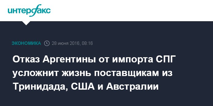Москва. 28 июня. INTERFAX.RU - Намерение Аргентины отказаться от импорта сжиженного природного газа (СПГ) в течение пяти-шести лет усложнит жизнь поставщикам из таких государств, как Тринидад и Тобаго, США и Австралия.