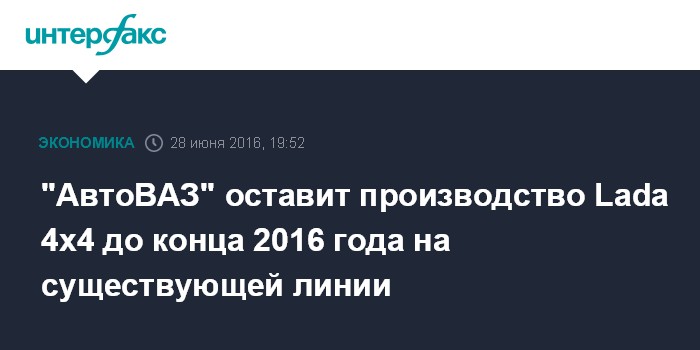 Москва. 28 июня. INTERFAX.RU - ОАО "АвтоВАЗ" продолжит производить Lada 4x4 до конца 2016 года на существующей линии в корпусе N62, планов по переносу производства на другую сборочную линию в 2016 году нет.