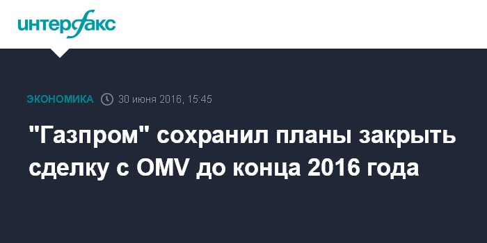 Москва. 30 июня. INTERFAX.RU - "Газпром" сохраняет планы закрыть сделку с OMV до конца 2016 года, сообщил журналистам зампредседателя правления газового концерна Александр Медведев.