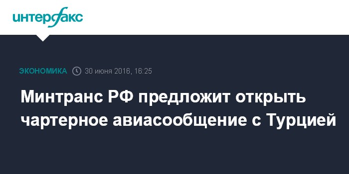 "В рамках поручения президента РФ Владимира Путина о нормализации торгово-экономических связей России и Турции председателем правительства РФ Дмитрием Медведевым 30 июня 2016 года дано поручение о проработке вопроса по возобновлению чартерных авиаперелетов между Российской Федерацией и Турецкой республикой. В ходе этой работы Минтрансом России будут подготовлены соответствующие предложения, направленные на снятие действующих ограничений", - говорится в сообщении.