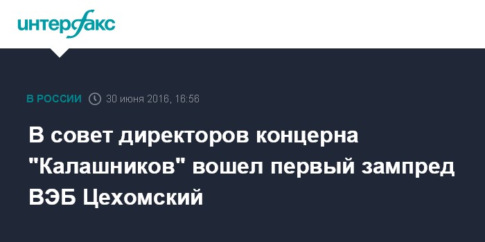 "В состав совета директоров концерна "Калашников", входящего в госкорпорацию "Ростех", в качестве независимого директора вошел первый заместитель председателя Внешэкономбанка - член правления Николай Цехомский. Решение было принято 30 июня 2016 года на общем собрании акционеров концерна "Калашников", - сообщили в пресс-службе.