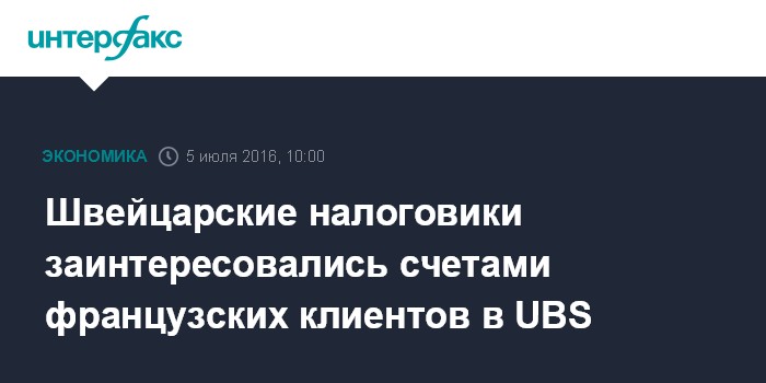 Москва. 5 июля. INTERFAX.RU - Федеральное налоговое управление Швейцарии (FTA) потребовало от банка UBS AG раскрытия информации о счетах ряда французских клиентов банка на основании запроса от властей Франции, подозревающих банк в помощи в уклонении от налогов.