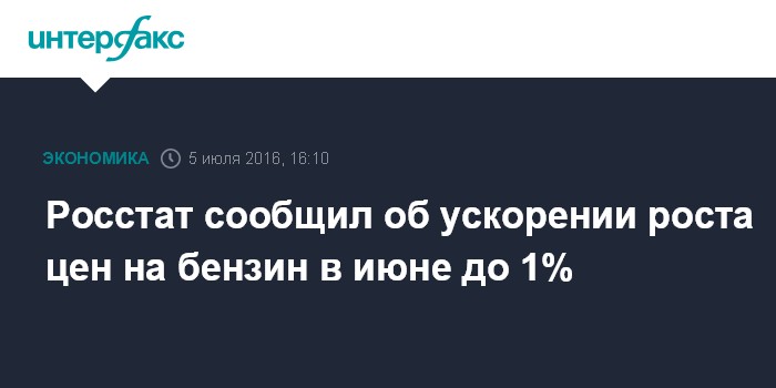 Москва. 5 июля. INTERFAX.RU - Розничные потребительские цены на бензин в России в июне подскочили сразу на 1,0% после роста на 0,1% в мае, по 0,8% в апреле и марте, снижения на 0,1% в феврале, снижения на 0,4% в январе, сообщила в понедельник Федеральная служба государственной статистики (Росстат).