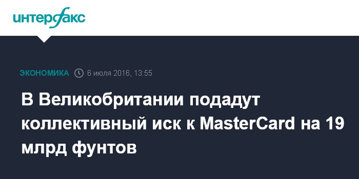 Москва. 6 июля. INTERFAX.RU - Британские потребители подготовили коллективный иск к MasterCard Inc., заявив о потере ими в общей сложности порядка 19 млрд фунтов стерлингов ($24,3 млрд) в результате завышения платежной системой комиссий за обработку трансграничных операций по дебетовым и кредитным картам в пределах Евросоюза.