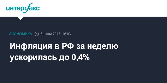 Москва. 6 июля. INTERFAX.RU - Инфляция в РФ за неделю с 28 июня по четвертое июля составила 0,4%, сообщил в среду Росстат. Предыдущие три недели цены росли по 0,1% в неделю.