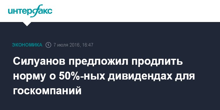Москва. 7 июля. INTERFAX.RU - Министр финансов РФ Антон Силуанов на заседании правительства в четверг предложил пролонгировать норму минимального уровня дивидендов для госкомпаний на уровне 50%.
