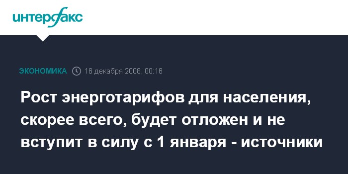 Москва. 16 декабря. ИНТЕРФАКС - Энерготарифы для населения, скорее всего, не вырастут с начала года.