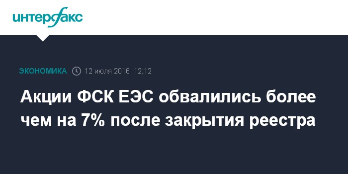 Москва. 12 июля. INTERFAX.RU - Акции "ФСК ЕЭС" днем во вторник обвалились более чем на семь процентов из-за распродаж бумаг после закрытия реестра акционеров для выплат дивидендов за 2015 год.
