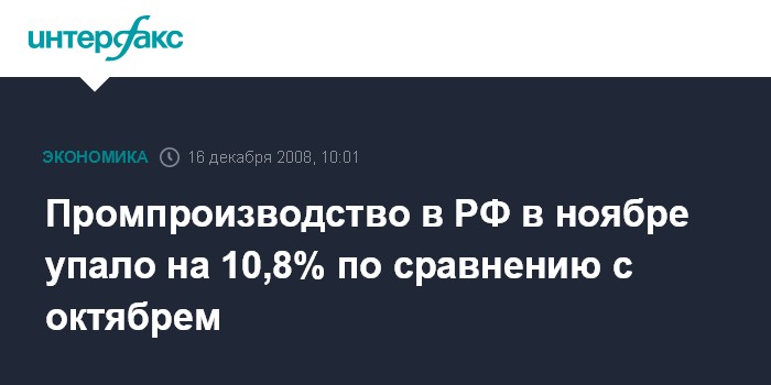Москва. 16 декабря. INTERFAX.RU - Промышленное производство в России в ноябре 2008 г. упало на 10,8% против октября текущего года, сообщила во вторник Федеральная служба государственной статистики (Росстат). Без учета сезонного фактора падение темпов промпроизводства в ноябре, как ранее сообщал "Интерфакс", составило 7,5%.