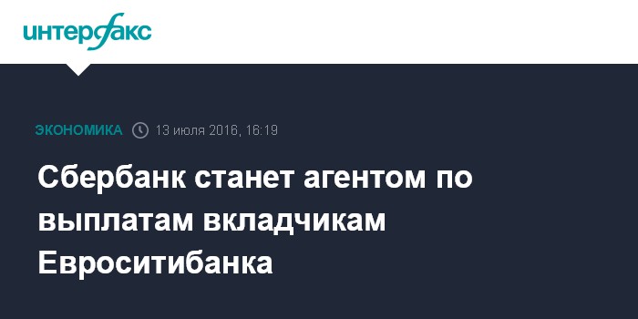 Москва. 13 июля. INTERFAX.RU - Сбербанк стал победителем конкурса по отбору агентов для выплаты страхового возмещения вкладчикам Евроситибанка (Мытищи, Московская область), говорится в сообщении Агентства по страхованию вкладов (АСВ).