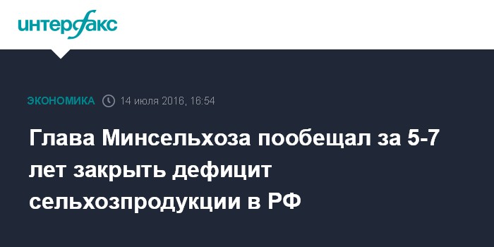 Москва. 14 июля. INTERFAX.RU - Глава Минсельхоза РФ Александр Ткачев уверен, что в течение пяти-семи лет дефицит сельхозпродукции в РФ удастся полностью закрыть и обеспечить рынок товарами отечественного производства.