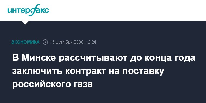 Москва. 16 декабря. INTERFAX.RU - Первый заместитель премьер-министра Белоруссии Владимир Семашко надеется, что до конца нынешнего года будет подписан контракт на поставку российского природного газа в республику в 2009 году.