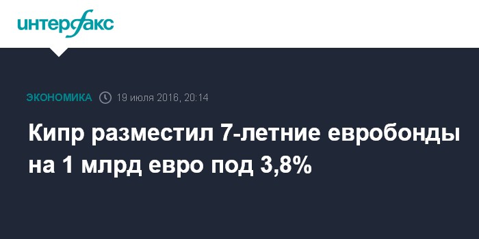 Москва. 19 июля. INTERFAX.RU - Кипр разместил выпуск семилетних евробондов на один млрд евро с доходностью 3,8%, сообщил "Интерфаксу" руководитель управления рынков долгового капитала "ВТБ Капитала" Андрей Соловьев.