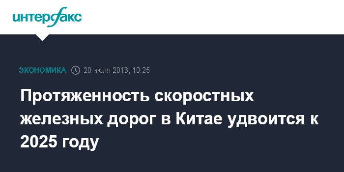 Москва. 20 июля. INTERFAX.RU - Протяженность железных дорог в Китае к 2025 году составит около 175 тыс. км, говорится в опубликованном в среду средне- и долгосрочном плане развития железнодорожной сети в Китае.