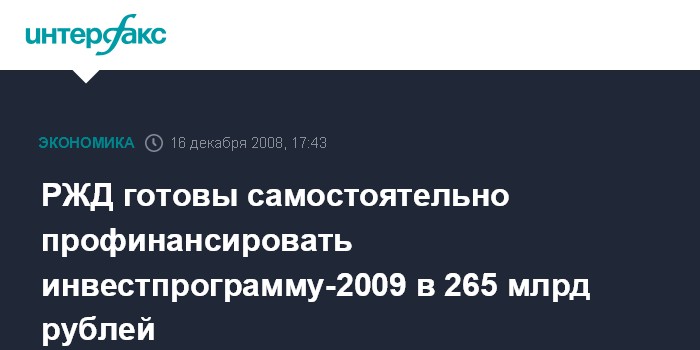 Москва. 16 декабря. INTERFAX.RU - ОАО "Российские железные дороги" (РЖД) готово самостоятельно профинансировать инвестпрограмму на 2009 год в размере 265 млрд рублей, сообщил президент РЖД Владимир Якунин журналистам во вторник.