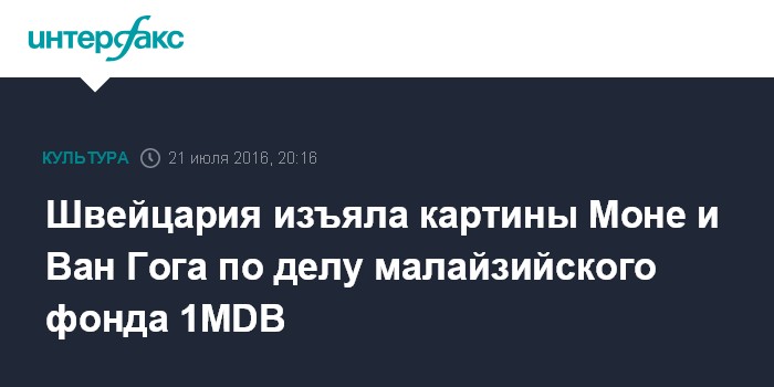 Москва. 21 июля. INTERFAX.RU - Швейцарские власти по запросу США изъяли работы Винсента ван Гога и Клода Моне в рамках расследования дела о хищении денег из малайзийского государственного фонда 1Malaysia Development Berhad (1MDB), сообщает "Би-би-си".