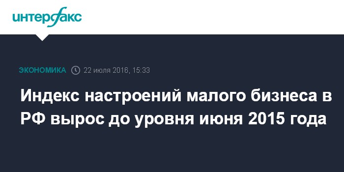 Москва. 22 июля. INTERFAX.RU - Малый бизнес научился жить в новых условиях, Индекс настроений малого бизнеса к июню 2016 года заметно вырос по сравнению с ноябрем 2015 года и вернулся на уровень июня 2015 года. Такой вывод сделан в рамках исследования, проведенного Альфа-банком путем опроса его клиентов с выручкой до 350 млн рублей в год.