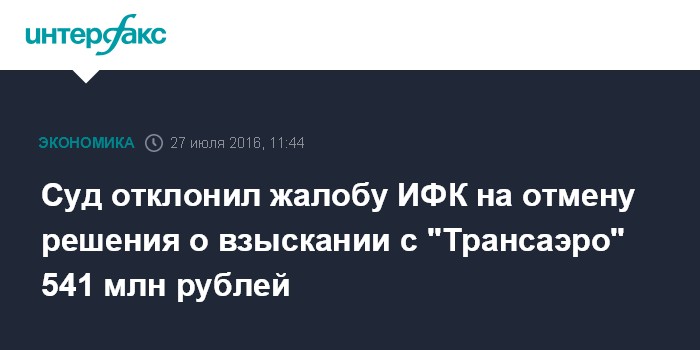 Суд отклонил жалобу ИФК на отмену решения о взыскании с "Трансаэро" 541 млн рублей