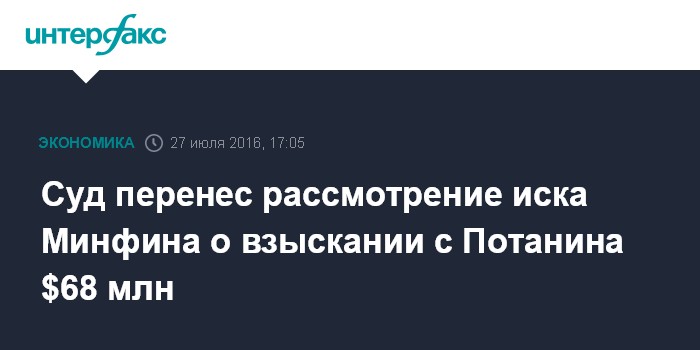 Суд перенес рассмотрение иска Минфина о взыскании с Потанина $68 млн