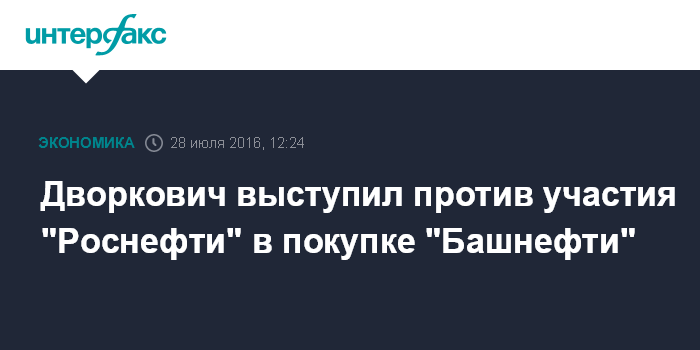 Москва. 28 июля. INTERFAX.RU - "Роснефть" не может участвовать в приватизации "Башнефти", поскольку это государственная компания, заявил газете "Ведомости" вице-премьер РФ Аркадий Дворкович.