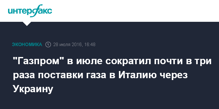 Москва. 28 июля. INTERFAX.RU - "Газпром" в конце июля резко снизил поставки газа в Италию, и, соответственно снизил транзит через Украину, в то время как его конкурент - Норвегия - поставки нарастила, свидетельствует отраслевая статистика.