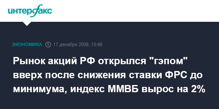 Москва. 17 декабря. INTERFAX.RU - Рынок акций РФ открылся в среду "гэпом" вверх по всему спектру blue chips после снижения ставки ФРС США до минимума (до 0,25% с 1% годовых), индекс ММВБ за минуту торгов вырос на 2%.