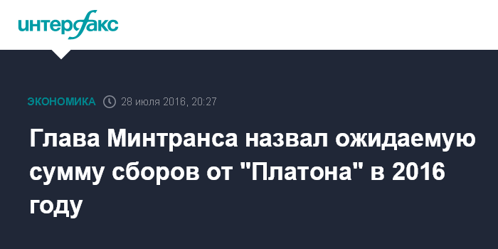 Москва. 28 июля. INTERFAX.RU - Сборы от системы взимания платы с грузовиков "Платон" в 2016 г. планируются на уровне 20 млрд руб., заявил министр транспорта РФ Максим Соколов в эфире телеканала "Россия 24" в четверг.