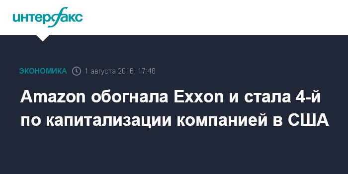 Москва. 1 августа. INTERFAX.RU - Amazon.com Inc. в ходе торгов в понедельник обогнала Exxon Mobil Corp. и заняла четвертое место по капитализации среди американских компаний, пишет MarketWatch.