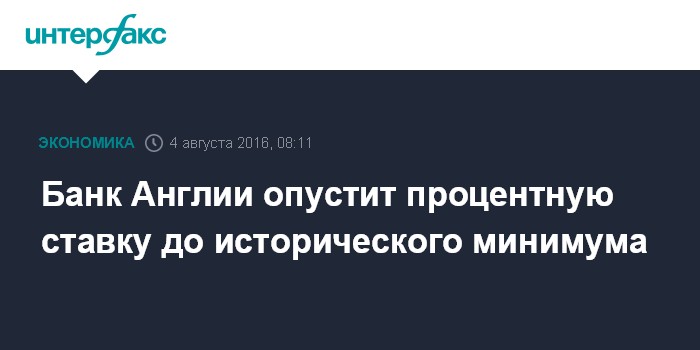 Москва. 4 августа. INTERFAX.RU - Банк Англии снизит процентную ставку впервые более чем за семь лет и опустит ее до нового исторического минимума с целью стимулирования экономики страны после решения британцев о выходе из Европейского союза, уверены большинство экспертов.