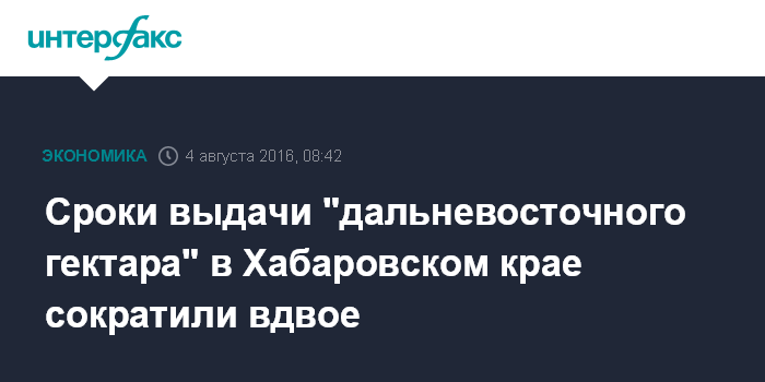 Москва. 4 августа. INTERFAX.RU - Сроки выдачи "дальневосточного гектара" в Хабаровском крае сокращены с 30 до 16 дней, сообщил журналистам губернатор края Вячеслав Шпорт по итогам совещания под председательством полпреда президента РФ в ДФО Юрия Трутнева о реализации закона в Хабаровске.