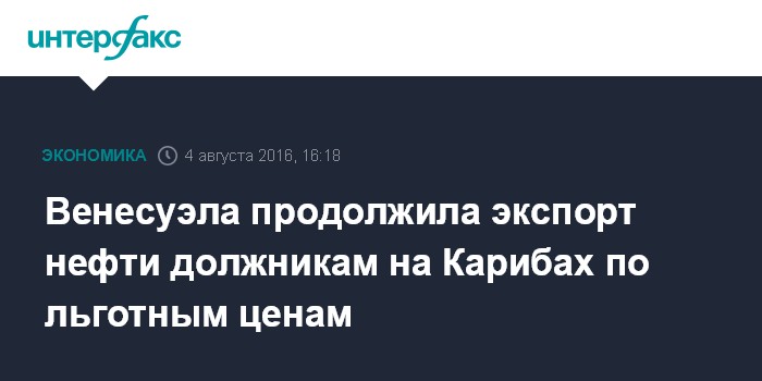 Москва. 4 августа. INTERFAX.RU - Венесуэла, экономика которой находится в плачевном состоянии, продолжает ежемесячно поставлять сотни тысяч баррелей нефти по льготным ценам в страны Центральной Америки и Карибского бассейна в рамках соглашения, заключенного странами региона еще в 2005 году.