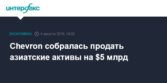 Москва. 4 августа. INTERFAX.RU - Американская нефтегазовая корпорация Chevron Corp. намерена продать азиатские активы на сумму до $5 млрд, сообщает MarketWatch со ссылкой на информированные источники.