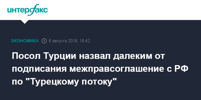 Москва. 6 августа. INTERFAX.RU - Посол Турции в России Умит Ярдым не видит перспектив заключения между Москвой и Анкарой межправсоглашения по газопроводу "Турецкий поток" в ближайшее время.