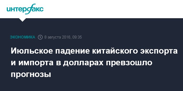 Москва. 8 августа. INTERFAX.RU - Китайской экспорт в долларовом выражении в июле 2016 года упал на 4,4% в годовом выражении, тогда как объем импорта рухнул на 12,5%, свидетельствуют опубликованные в понедельник данные Главного таможенного управления КНР.