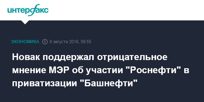 Москва. 8 августа. INTERFAX.RU - Министр энергетики РФ Александр Новак согласен с отрицательным мнением Минэкономразвития по поводу участия "Роснефти" в приватизации "Башнефти".
