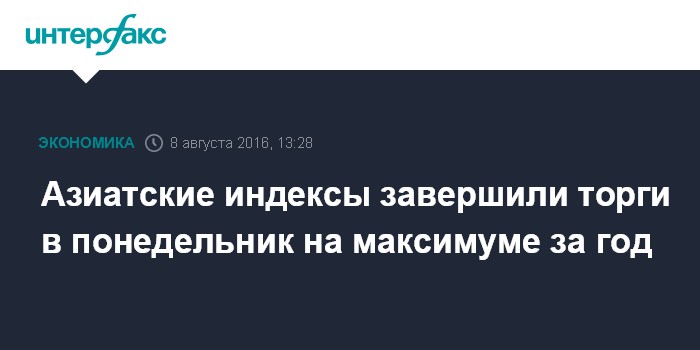 Москва. 8 августа. INTERFAX.RU - Фондовые индексы Азиатско-Тихоокеанского региона (АТР) завершили торги в понедельник на максимальном уровне за год благодаря росту цен на сырье, вызванному оптимизмом по поводу экономики США.
