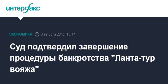 Ранее сообщалось, что Арбитражный суд Москвы третьего марта завершил процедуру банкротства туроператора "Ланта-тур вояж". Девятый арбитражный апелляционный суд в июне оставил решение в силе.