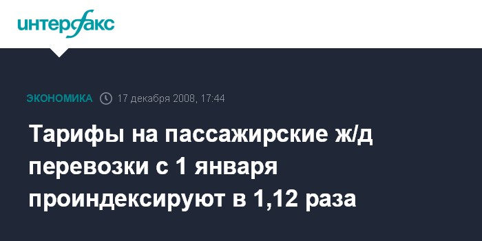 Москва. 17 декабря. INTERFAX.RU - Правление Федеральной службы по тарифам (ФСТ) приняло решение об индексации с 1 января тарифов на пассажирские железнодорожные перевозки в среднем в 1,12 раза.
