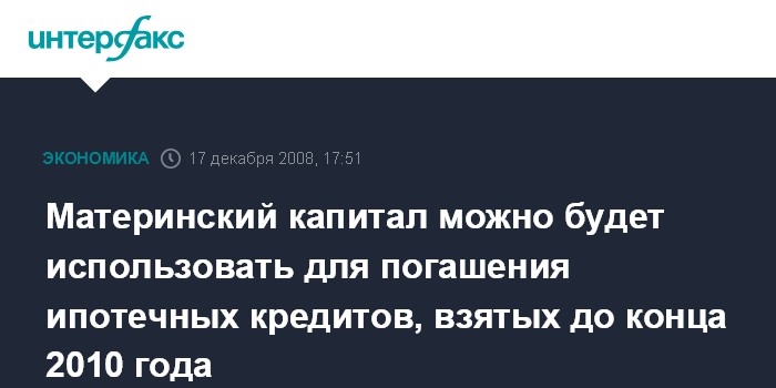Москва. 17 декабря. INTERFAX.RU - Использовать материнский капитал для погашения ипотечного кредита смогут семьи, которые возьмут кредит до 31 декабря 2010 года. Такое решение было принято на заседании правительства РФ 10 декабря.
