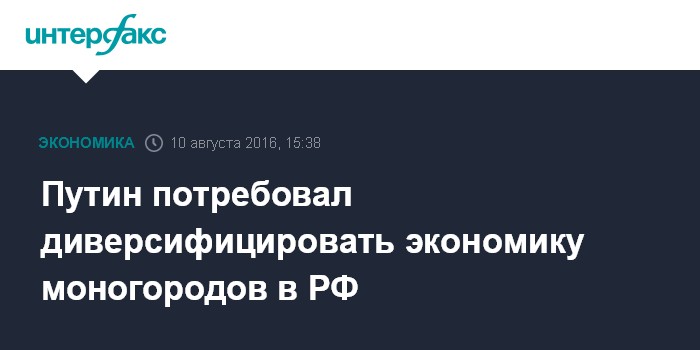 Москва. 10 августа. INTERFAX.RU - Работу по диверсификации экономики в моногородах необходимо "настойчиво продолжать", заявил президент РФ Владимир Путин в ходе совещания с членами правительства.