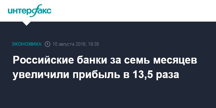 Москва. 10 августа. INTERFAX.RU - Российские банки в январе-июле 2016 года увеличили прибыль в 13,5 раза по сравнению с аналогичным периодом прошлого года, до 459 млрд рублей, свидетельствует статистика на сайте ЦБ РФ.