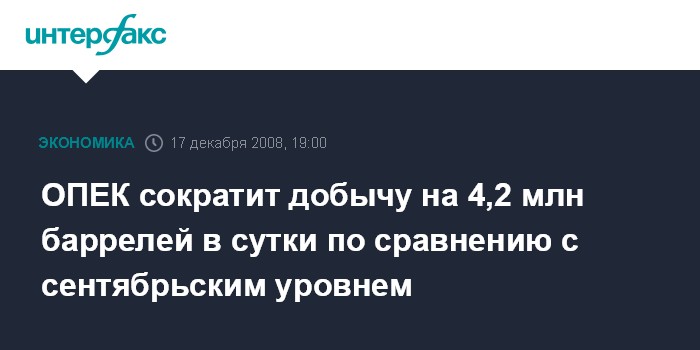 Москва. 17 декабря. INTERFAX.RU - ОПЕК сократит добычу на 4,2 млн баррелей в сутки (б/с) по сравнению с сентябрьским уровнем производства, заявил генеральный секретарь ОПЕК Абдалла Эль-Бадри, сообщает агентство Bloomberg.