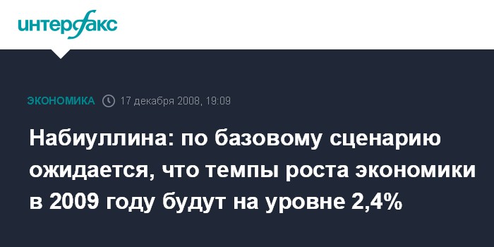 Набиуллина: по базовому сценарию ожидается, что темпы роста экономики в 2009 году будут на уровне 2,4%