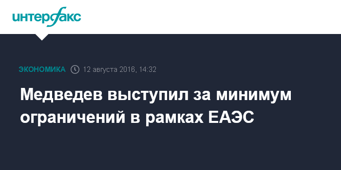 Москва. 12 августа. INTERFAX.RU - Премьер РФ Дмитрий Медведев призвал коллег по Евразийскому экономическому союзу при подготовке союзных документов стремиться к тому, чтобы в них был минимум ограничений и изъятий.