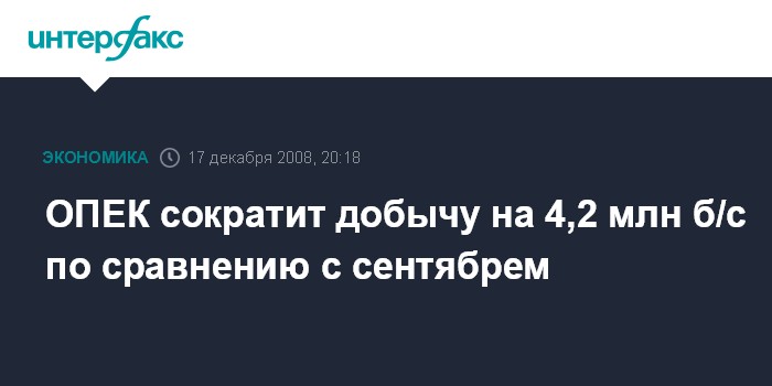 Москва. 17 декабря. INTERFAX.RU - ОПЕК сократит добычу на 4,2 млн баррелей в сутки (б/с) по сравнению с сентябрьским уровнем производства, заявил генеральный секретарь ОПЕК Абдалла Эль-Бадри по итогам заседания стран-участниц организации, состоявшегося в среду, сообщает агентство Bloomberg.