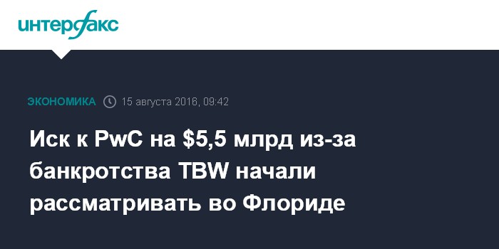 Москва. 15 августа. INTERFAX.RU - Суд штата Флорида в Майами рассматривает иск к аудиторской компании PwC на $5,5 млрд в связи с крахом одного из ведущих ипотечных андеррайтеров в США - Taylor, Bean & Whitaker (TBW), обанкротившегося в 2009 году.