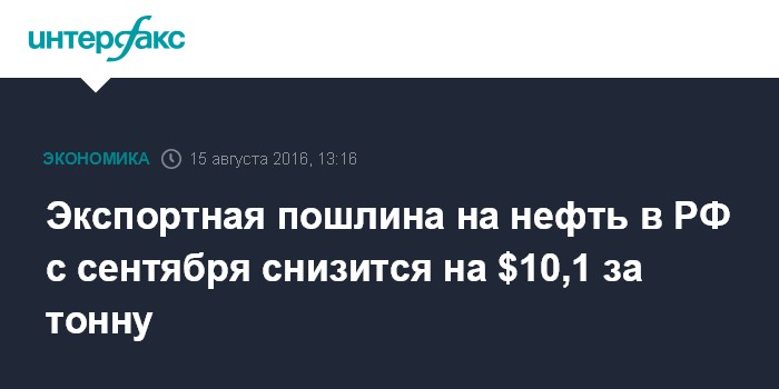 Москва. 15 августа. INTERFAX.RU - Экспортная пошлина на нефть в РФ с 1 сентября 2016 года составит $80 за тонну, говорится в материалах на сайте Минфина РФ.