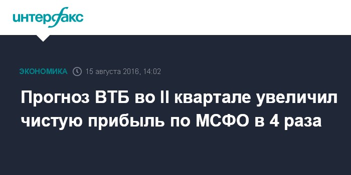 Москва. 15 августа. INTERFAX.RU - ВТБ во втором квартале 2016 года заработал 4,7 млрд рублей чистой прибыли по МСФО, увеличив результат в четыре раза по сравнению с прибылью за тот же период прошлого года, свидетельствует консенсус-прогноз "Интерфакса".
