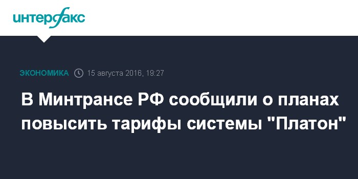 Москва. 15 августа. INTERFAX.RU - Министерство транспорта РФ говорит о возможности повышения тарифа в системе "Платон", а также об отмене скидок для массовых и тяжеловесных грузов на железной дороге на период речной навигации.